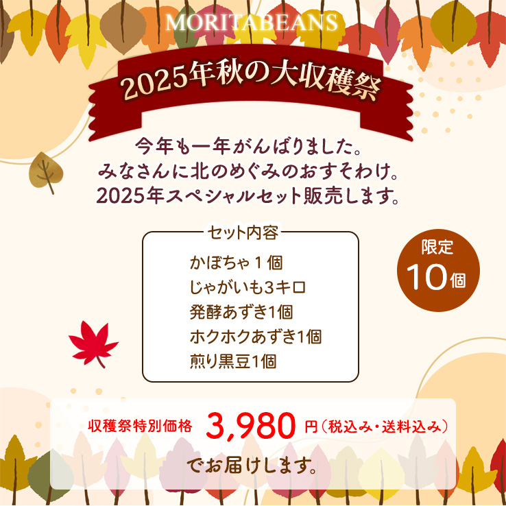小豆らいふへ季節限定 じゃがいも 秋の収穫祭福袋2025【数量限定】【送料無料】 価格: ¥3,980 (税込) [ポイント還元 39ポイント~] 販売期間: 2025年11月20日20時00分~2025年12月15日22時59分 数量: 個 在庫: 10個 在庫 10個 返品についての詳細はこちら 商品説明 内容量 かぼちゃ1個 じゃがいも3kg(品種はおまかせ) 発酵あずき1個 ホクホクあずき1個(甘さほんのり)1個 煎り黒豆1個 賞味期限 パッケージに記載 保存方法 直射日光、高温多湿を避けて保存してください。 製造者 (株)A-Netファーム十勝 北海道上川郡清水町羽帯南2線106 TEL&FAX 0156-63-2789 関連商品 【北海道産小豆】森田農場極選セット 送料無料 ¥2,980(税込) 在庫 20 個 【北海道産小豆】森田農場堪能セット 送料無料 ¥4,500(税込) 在庫 20 個 ギフトAセット 十勝セット 送料無料 ¥4,980(税込) 在庫 49 個 ギフトBセット 赤黒セット 送料無料 ¥3,500(税込) 在庫 48 個 ギフトCセット ノンカフェインセット 日時指定不可 代引き不可 送料無料 ¥2,000(税込) 在庫 46 個 【送料無料】えっ?豆も食べられるお茶?農家直送だから安心!【北海道産 黒豆茶 たっぷりセット】なんとたっぷり240杯分 国産 ¥5,400(税込) 在庫 23 個 【北海道産】黒豆茶「健康」セット 国産 送料無料 ¥3,900(税込) 在庫 25 個